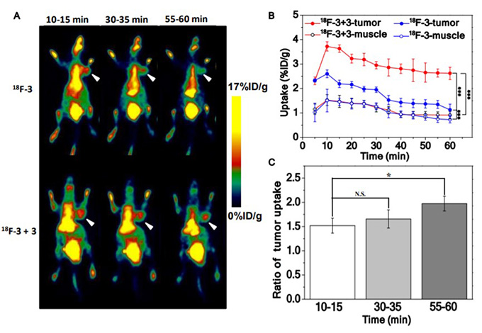 在上述實驗基礎上,研究團隊還進行了引入標記和共注射策略的優化實驗:通過在探針18F-3中引入三組組氨酸-谷氨酸親水肽鏈(HE)3標記,顯著減少肝臟蓄積,而不影響腫瘤攝??;采用共注射策略(18F-2 + 2和18F-3+ 3)使腫瘤攝取顯著增加,信噪比顯著提高。結果表明,探針18F-3對監測天冬酰胺內肽酶在腫瘤中的表達水平具有良好的特異性與靈敏度,對天冬酰胺內肽酶過表達相關的疾病在早期發現與療效監測方面具有較好的應用潛力。(創新藥物研究中心)