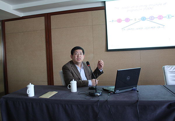 劉教授以圖文并茂的PPT形式介紹了他近年來通過研究發現的對于發炎及退化至關重要的一個新的生長因子progranulin(PGRN,也簡稱為GEP),并研發出一種源于PGRN的基因工程產品Atsttrin,主要針對風濕性關節炎及其它炎癥性關節炎,目前已在申請FDA一類新藥。講座結束后,我所科研人員圍繞劉教授的講座內容結合自己的專業特點,與劉教授展開了熱烈地討論。