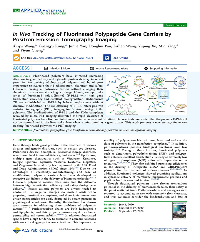 我所分子影像中心楊敏研究員團隊與華東師范大學程義云教授等合作,首次利用正電子發射斷層掃描成像技術(PET)對含氟多肽基因載體進行了活體、動態示蹤。近期,這一研究新成果發表在工程技術類一區期刊《ACS Applied Materials & Interfaces》上。