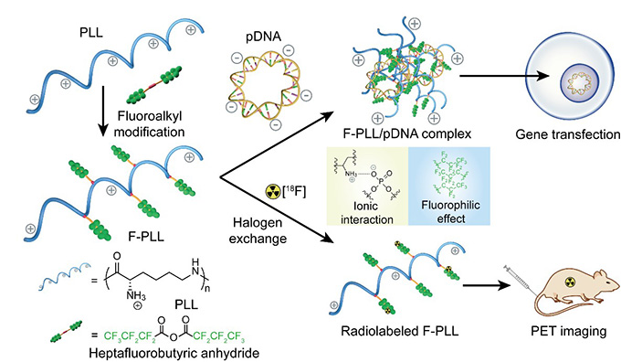圖3. 氟化聚賴氨酸的制備過程和18F放射性標記氟化聚賴氨酸多肽用于體內PET成像的示意圖
