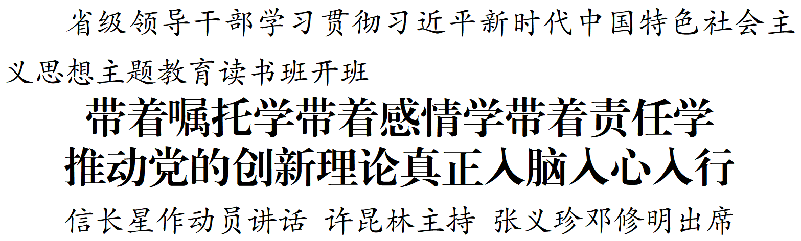 信長星強調,帶著囑托學、帶著感情學、帶著責任學,才能真正入腦,知其言更知其義,知其然更知其所以然;才能真正入心,內化為自覺、上升為信仰;才能真正入行,更好地改造主觀世界和客觀世界。辦好主題教育讀書班,省級領導干部要帶好頭、做示范,全省黨員干部都要珍惜難得的學習機會,靜下心來學,心無旁騖學,真正把馬克思主義看家本領學到手,更好為黨和人民履好職、盡好責。