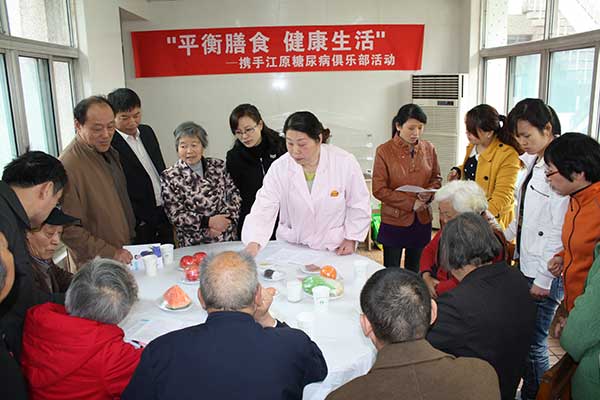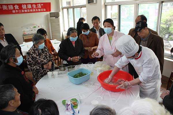 活動中,醫(yī)院營養(yǎng)師王少玲首先為患者進行糖尿病健康飲食的知識授課,她提醒患者們要合理控制熱能;平衡膳食;堅持定時定量進餐,提倡少食多餐;烹調要得法;多飲水,科學食用水果。她還指導患者們如何正確攝入碳水化合物、蛋白質、脂肪和膳食纖維,如何合理使用鹽、醬油和其他調味品,如何進行食物之間的等量交換。因為授課內容關系到日常生活,所以患者們都聽得津津有味。為了使患者們對課程能有一個感觀認識,醫(yī)院特地準備了“食物模型”,用實物進行講解。患者利用模型嘗試著安排自己的一日三餐,在營養(yǎng)師的指導下掌握了合理膳食的正確方法。活動還設計了“有獎知識問答”,患者們都踴躍答題,并展開討論。在“包餛飩共享美食”環(huán)節(jié)中,廚師向患者現(xiàn)場演示了和餡的過程,同時,營養(yǎng)師指導大家如何配比多樣食材的量和鹽油比例等。患者們圍著桌子一起包起了餛飩,現(xiàn)場氣氛熱鬧而溫馨。當熱騰騰的餛飩端來時,患者們根據(jù)自己每餐應該攝入的總量取用餛飩,享用著自己的勞動果實。通過親身參與,患者們都有所收獲,活動在大家的掌聲和感謝聲中圓滿結束。