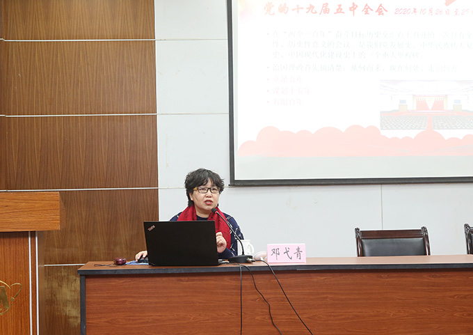 為認(rèn)真學(xué)習(xí)貫徹黨的十九屆五中全會(huì)精神,12月11日下午,在所學(xué)術(shù)報(bào)告廳,所黨委舉辦專題輔導(dǎo)報(bào)告會(huì),邀請(qǐng)無(wú)錫市委黨校二級(jí)調(diào)研員鄧弋青作題為《擘畫(huà)新藍(lán)圖,開(kāi)啟新征程——學(xué)習(xí)領(lǐng)會(huì)十九屆五中全會(huì)精神》的專題報(bào)告,全所中層及以上干部、黨員、入黨積極分子、職工代表參加了報(bào)告會(huì)。會(huì)議由所黨委書(shū)記、所長(zhǎng)謝敏浩主持。