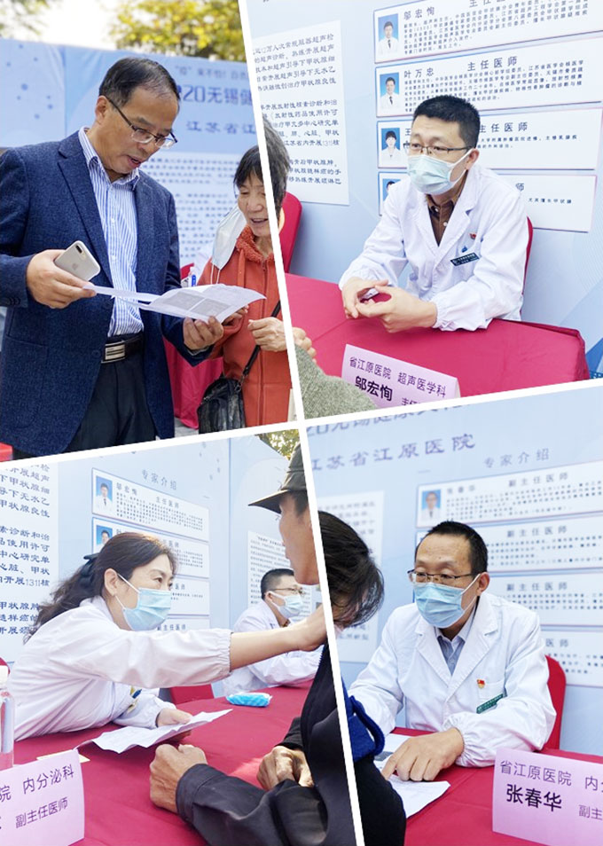 江蘇省江原醫院義診團隊由來自內分泌科、外科、神經內科、腫瘤科、超聲科、核醫學科的8位副主任醫師以上的專家組成。他們發揮業務專長,為現場絡繹不絕的問診群眾提供甲狀腺疾病相關的專業幫助和其他方面疾病的健康建議,贏得現場群眾的好評贊譽。還有多位患者在江原醫院義診區偶遇熟悉的就診專家,驚喜之余現場分享自己的健康近況,展示自己的治療成效,對江原專家的感謝之情和重獲健康的信心溢于言表。
