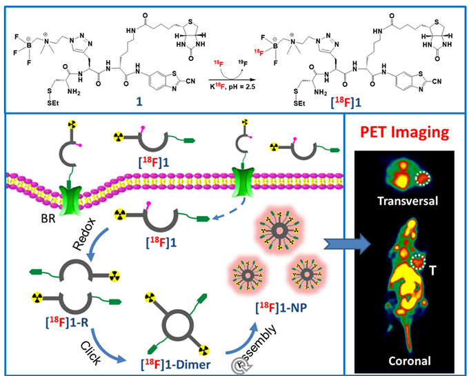 近日,我所創(chuàng)新藥物研究中心林建國研究員、邱玲研究員團(tuán)隊在中科院1區(qū)Top期刊《ACS Nano》(IF=15.881)上在線發(fā)表論文,報道了一種腫瘤微環(huán)境響應(yīng)激活型智能小分子PET探針,成功實現(xiàn)了探針放射性信號較長時間滯留在特定的靶組織中,達(dá)到了高特異性、高靈敏度的PET顯像效果,為發(fā)展新一代核素靶向診療分子探針提供了新的策略。