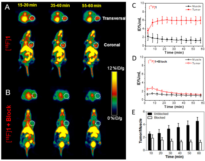 在生物素受體過表達(dá)的肺癌A549和宮頸癌Hela動物模型中,分子探針[18F]1給藥15分鐘后即可獲得高靶本比的PET圖像,60 min時腫瘤/肌肉靶本比仍大于4;而在生物素受體低表達(dá)的結(jié)腸癌HCT116荷瘤鼠中,探針[18F]1對腫瘤幾乎無顯像能力,說明該分子探針具有良好的特異性。對于缺失生物素靶向基團(tuán)或沒有還原自組裝功能的對照探針[18F]1a和[18F]1b,難以在生物受體過表達(dá)的腫瘤中進(jìn)行富集,說明腫瘤靶向和自組裝協(xié)同策略可有效提高PET分子探針的顯像效果。該策略對設(shè)計發(fā)展新一代核素靶向診療藥物具有重要的參考價值。