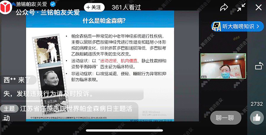 授課專家們圍繞帕金森病全程管理、手術前后常見問題、患者跌倒預防、初確診患者個體化治療方案等方面開展講授。結合患者臨床癥狀,生動講解了帕金森病的運動癥狀和非運動癥狀,運用視頻展播的方式,重點強調了“早發現、早診斷、早治療”的健康管理理念,鼓勵患者積極堅持全程治療,提高生活質量。本次線上公益直播活動,共計近2000人次參與互動。最后,李建副主任針對在線“帕友”們提出的問題,給出了健康建議。(省江原醫院內科)